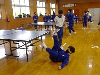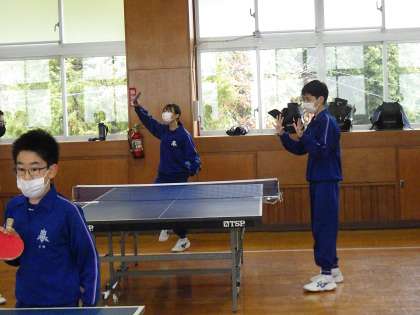 試合会場そのものがトーナメントになっていて、勝てば勝者の卓球台へ、負ければ敗者の卓球台に進んでいきます。1台に4名がつどい、総当たりで対戦していきます。