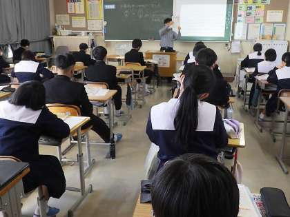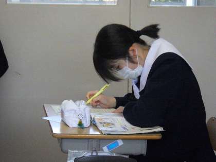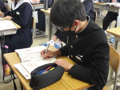 日露戦争について学んでいました。教科担任の説明や映像資料で紹介されていることを、学習プリントにどんどん書き込んでいきます。