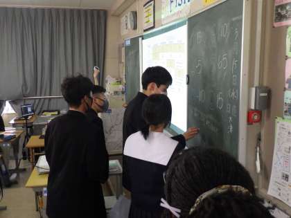 今日は、今年度最終となるALTとのコミュニケーション活動の授業でした。これまで学習してきたことがクイズとして出題され、グループ対抗で得点を競います。正解すると選択したマスに示された得点がゲットできますが、必ずプラスとは限りません。また、「トルネード(渦巻き)マーク」が出てしまうと、全グループの得点がリセットされてしまいます。
