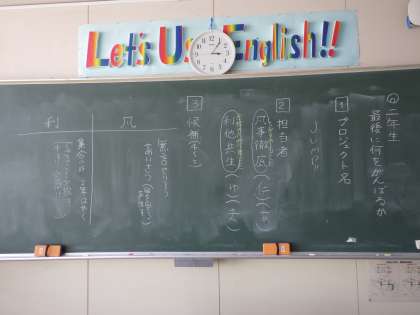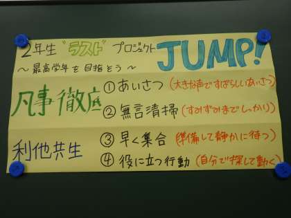 3年生が卒業して1週間余りが過ぎました。現在は、2年生が学校の顔として生活しています。そして「真の最高学年」となるため、その意識が形となって動き出します。2年生の隣の教室の黒板には、動き出そうとしているプロジェクトの様子が示されていました。