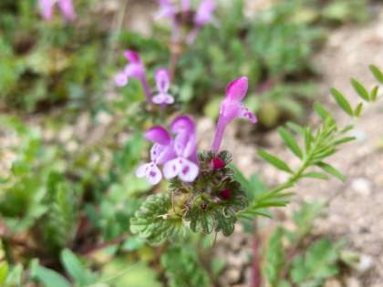 校内のあちこちで見かける、小さくかわいらしい濃いピンク色の花が特徴の「ホトケノザ」。葉の形が仏様の台座(蓮座)のように見えるというのが名前の由来です。また、葉が段状に付くところから3階建ての屋根に見立てて、「サンガイクサ」という別名を持っています。