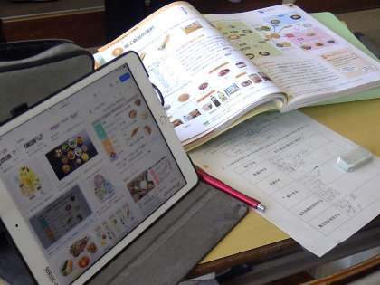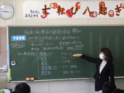「加工食品のの特徴と表示や選び方を知ろう」をテーマに学習が進められていました。身の回りにある加工食品にもたくさんの種類があり、保存性や利用のしやすさがあることを調べていきます。また最近では、おいしさも増してきているので、用途に合った選び方を工夫していくことを学んでいました。