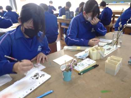 「絵手紙で春のメッセージを描こう」をテーマに作品づくりに取り組んでいました。各自が用意した様々な素材から、自分の作品のイメージに合った絵手紙を作成していきます。