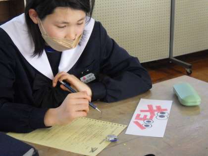 オノマトペの作品も完成し、今日は自身の評価に取り組んでいました。また、仲間にもアドバイスをもらったりして、作品のアピール文を書いていました。