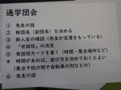 新団長・副団長の決定に始まり、新入生の確認や新入生のサポートを中心となって行う「世話役」も決めていきます。「世話役」は入学式前に新入生の自宅を訪問し、自己紹介と注意事項を伝えてきます。