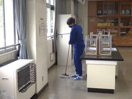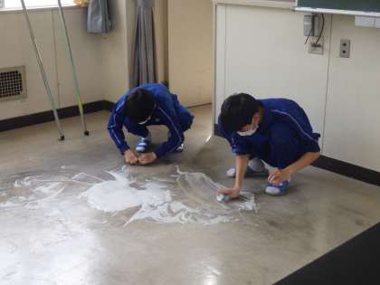 自身の教室はもちろん、理科室や音楽室、美術室の床もきれいに磨き上げられ、丁寧にワックスが塗られていました。1・2年生のみの活動でしたが、3年生が行った『愛校活動』の「立つ鳥 心を残す」の意識に並ぶ、素晴らしい活動ぶりでした。