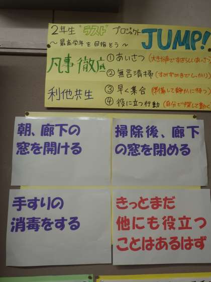 「J(JUMP)プロジェクト」と題して始まった2年生の取組。最高学年になるための意識改革が、生徒たちの手によって進められています。