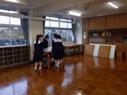 大掃除・ワックスがけのために廊下に並べられていたものを、登校してきた生徒が協力して、次々に運び込んでいる姿を見かけました。