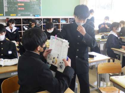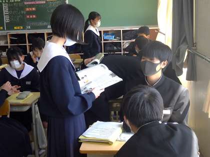 次回の授業で暗唱発表会が行われるため、今日は直前の練習が行われていました。グループ内で分担をして発表していくため、仲間のレベルを上げるために協力して取り組んでいました。有終の美が飾れ得るよう、本番直前まで今の気持ちで練習を続けてほしいと思います。