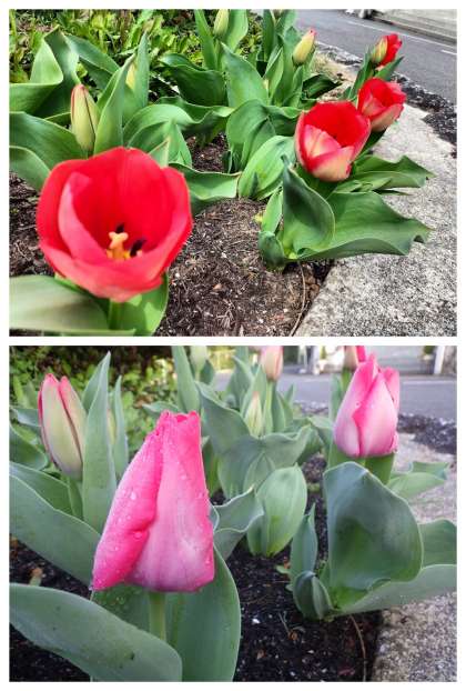 正門ロータリーの花壇の一角に植わるチューリップ。昼の顔と朝の顔が違い、見ていて興味をそそられます。