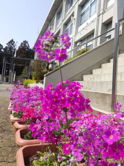 卒業式に会場を彩ったサクラソウ。現在も校舎前の日当たりの良い場所できれいに咲いています。周りの木々にも花が咲き始め、学校全体が華やかな雰囲気に包まれる季節です。