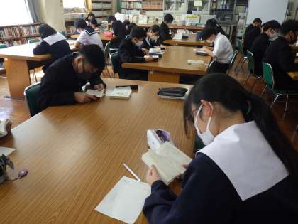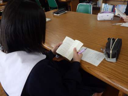 ビブリオバトルに向けて準備を進めていました。相手が読みたくなるような書評を考え、パフォーマンスの仕方も練習していきます。