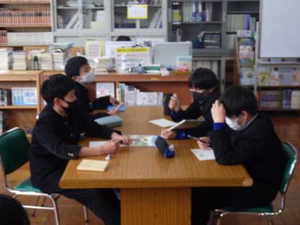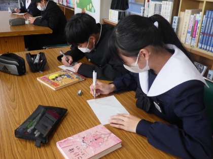 ビブリオバトルに向けて準備を進めていました。相手が読みたくなるような書評を考え、パフォーマンスの仕方も練習していきます。