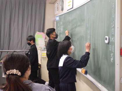 教科担任から出題される様々なお題に、チームで協力して競い合っています。学習した単語のスペルが正しく書けているかなども確認しながら、仲間と声をかけ合って楽しそうに活動していました。