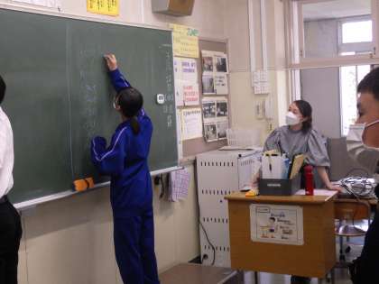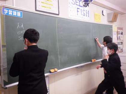 今回は、本日2回目の授業です。今年度の学習すべき内容が終わったため、チーム対抗で英語のゲームを行っていました。