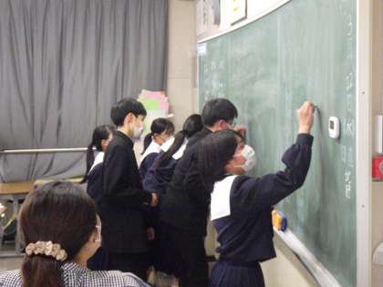 教科担任から出題される様々なお題に、チームで協力して競い合っています。学習した単語のスペルが正しく書けているかなども確認しながら、仲間と声をかけ合って楽しそうに活動していました。