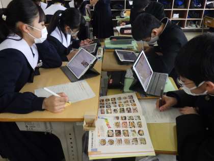 「郷土料理と地域の食材」という単元で、「地産地消をめざし、この地域のお気に入り料理を探そう」をテーマに学習が進められていました。