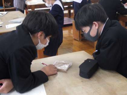 教科担任の説明を聞いているうちからも、アイデアをシートに描き込んでいる生徒の姿から、作品づくりへの意欲が感じられました。