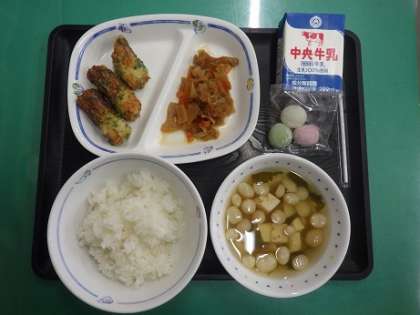 4/14 今日の給食 公開日 2023/04/14 更新日 2023/04/14 各学年から 今日の献立は花見献立で、ふだま汁、ちらしずし、ちくわの磯辺揚げ、花見だんご、牛乳 でした。 エネルギー:851kcal