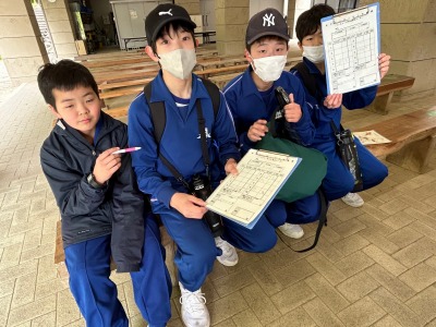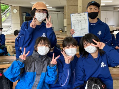 1年生の宿泊学習では、オリエンテーリングの課題をクリアして各グループが続々とゴールしています。幸い、雨はまだ降っていませんが、じっとしていると寒さを感じる気温です。