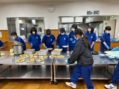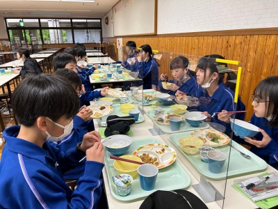 1年生の宿泊学習は2日目の朝を向かえました。天気は雨模様ですが、起床した生徒たちは各部屋の寝具の片づけを済ませて、全員元気に朝食を食べました。