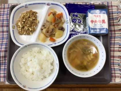 今日の献立は、あおさ汁、肉じゃが、納豆巻き、手巻きのり、ごはん、牛乳 でした。 エネルギー:803kcal