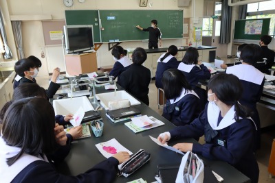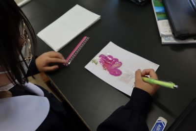 1年生の理科は、敷地内に咲き始めたツツジの花を使って、花の構造と名称を学んでいます。外側から慎重に分解されたパーツを順番に並べて、各自が「押し花風」の手製標本を作っています。