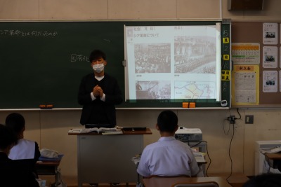 3年生の社会は、第一次世界大戦後の世界の変化や様子について学びました。ソビエト社会主義共和国連邦(ソ連)を早口言葉のように唱えるなど、今では聞きなじみのない国名にも挑戦しました。
