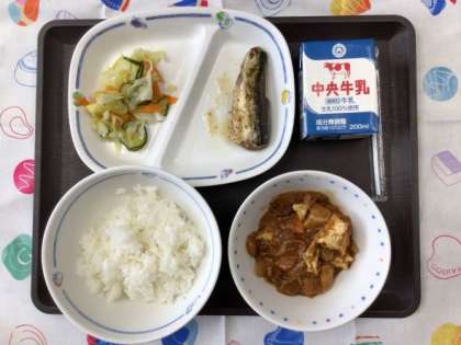 今日の献立は、生揚げのみそ炒め、甘酢あえ、いわしのしょうが煮、ごはん、牛乳 でした。   エネルギー:816kcal