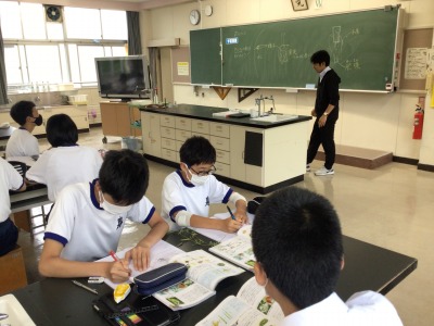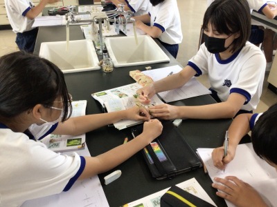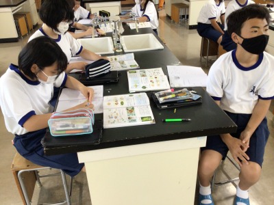 学校公開日の1年生 理科の授業は、近くで採取したカラスノエンドウの実物を使って、種子植物の果実(種子)について学びました。カラスノエンドウは、極小サイズなので、食用には不向きです。