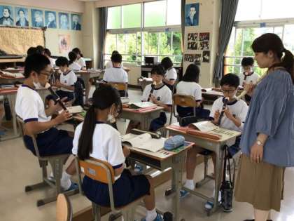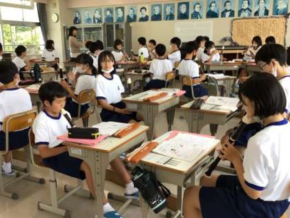 1年生は音楽でアルトリコーダーの練習に取り組んでいます。小学校で扱っていたソプラノリコーダーよりも一回り大きなアルトリコーダーを手に、「大きいから指が動かしやすい」「小指が届きにくい」と言う声が聞こえてきました。グループで教え合いながら演奏しています。
