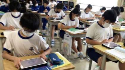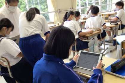 明日からの中間テストに向けて、一人で課題を進めたり、教え合って復習に取り組んだりしています。学習用タブレットを活用して、キュビナで学習内容の定着を確認する生徒も多くいます。