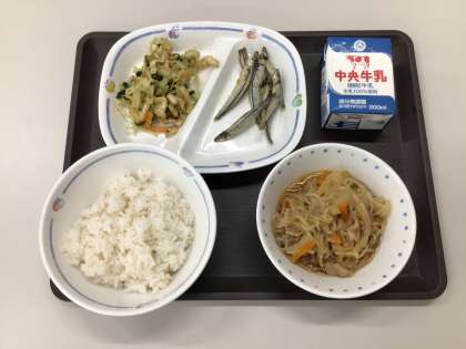 今日の献立は、豚丼、ごまあえ、きびなごのから揚げ、麦ごはん、牛乳 でした。 エネルギー:790kcal