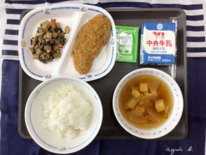 今日の献立は、けんちん汁、ひじきの炒め煮、青じそ入りあじフライ、抹茶ふりかけ、ごはん、牛乳 でした。   エネルギー:811kcal