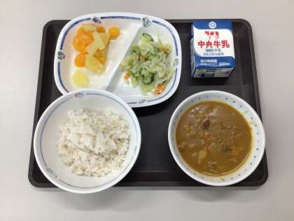 今日の献立は、カレーライス、チキンサラダ、ミックスフルーツ、麦ごはん、牛乳 でした。   エネルギー:894kcal