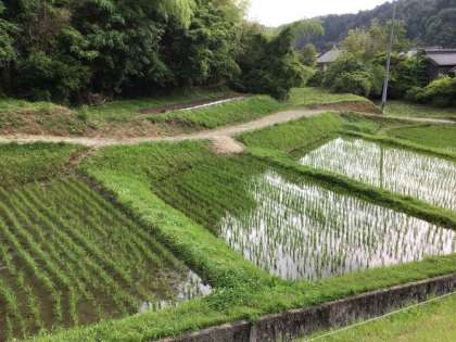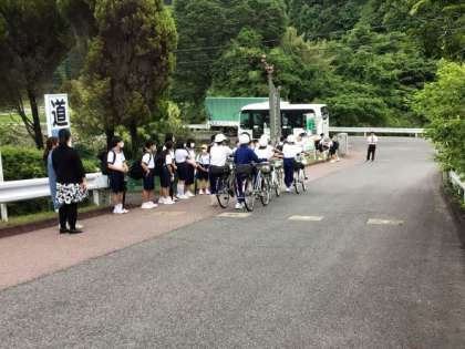 生徒が毎朝夕に登下校で通るあいさつの坂道から見える田んぼでは、5月9日に植えた苗が分けつし、順調に生長しています。大きな自転車が危なっかしく見えた1年生も、今では不安そうな表情を浮かべることなく登下校し、中学校に入学してからの2か月でたくましく成長しているなと感じます。