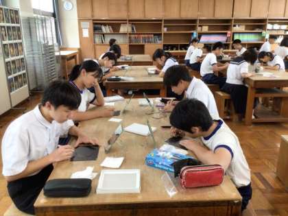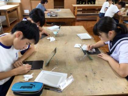 3年生は、美術の授業で自画像をスクラッチ画で描いています。どの子も鏡をしっかり見て自分の顔と向き合い、道具を使う音だけが響く美術室で集中して取り組んでいました。