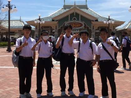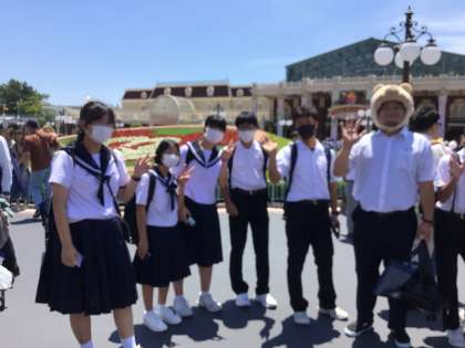 ディズニーランドに到着しました。天気がよすぎて暑いですが、班で思いっきり楽しんでいます。