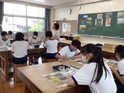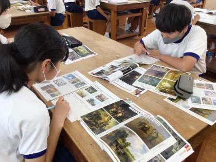 3年間の計画的な美術の指導の積み重ねで、学年が上がるにつれて作品のレベルが高くなっています。鑑賞についても、豊富な教具で作品を比較しながら考える機会を通して、絵画を見るポイントを学んでいました。