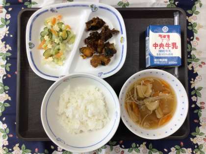 7/7 今日の給食 公開日 2023/07/07 更新日 2023/07/07 各学年から 今日の献立は、七夕献立で、七夕汁、チーズサラダ、レバーとかぼちゃの甘辛煮、ごはん、牛乳 でした。 エネルギー:805kcal