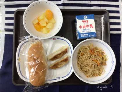 今日の献立は、炒めビーフン、レモンポンチ、餃子、米粉パン、牛乳 でした。 エネルギー:801kcal