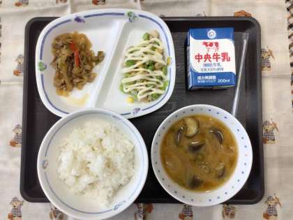 今日の献立は、たべまるのおすすめ、夏野菜のごまみそ汁、枝豆サラダ(マヨネーズ風ドレッシング)、ピーマンと豚肉の炒め物 ごはん、牛乳 でした。 エネルギー:814kcal