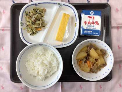 今日の献立は、肉じゃが、のり酢あえ、厚焼き卵、ごはん、牛乳 でした。   エネルギー:815kcal