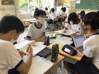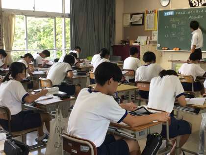 今朝、あいさつの坂道を登って登校してきた生徒は、口々に「暑い、暑すぎる」とつぶやいていました。厳しい暑さですが、冷房を使いながら学習に集中できるようにしています。