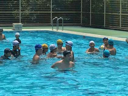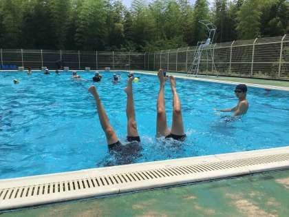 水泳の授業は、生徒の表情が和む時間です。WBGTを計測し、熱中症に注意しながら授業をしています。水中で逆立ちをする様子をカメラに収めてほしいという3年生のリクエストがありました。楽しそうな表情を見ると、こちらまで嬉しくなります。シンクロナイズドスイミングができそうな、見事な逆立ちでした。