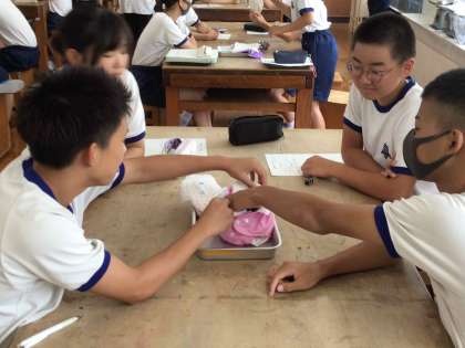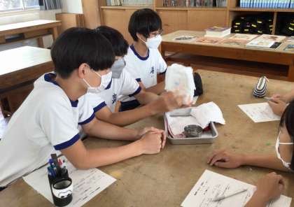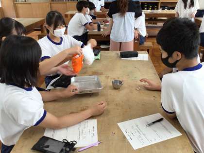 3年生の家庭科では、幼児の発達について学んでいます。今日は、オムツの吸水性や肌触りなどについて布と紙のオムツを比べました。水を吸収した後の紙オムツを持ち上げた生徒は、口々に「重っ!」とつぶやいていました。