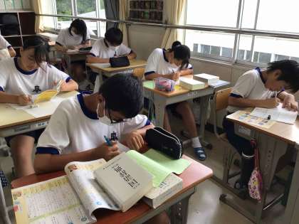 夏休みの宿題で、いちばん後回しにされやすい「読書感想文」。国語科の授業で、感想文の書き方や原稿用紙の使い方、選書の仕方等を学び、メモを作成して文章を書く学習に取り組んでいます。感想文を書くことで、本の世界をより深く味わってほしいと思います。