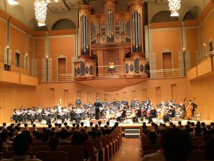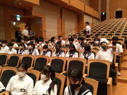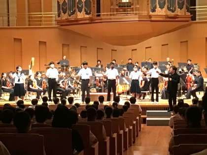 8月24日(木)、3年生は全校出校日に「心に残る記念事業」豊田市中学生のためのコンサートに参加しました。豊田参合館10〜13階の豊田市コンサートホールで、名古屋フィルハーモニー交響楽団の演奏です。広いコンサートホールにドキドキしながらも、素晴らしい演奏に聴き入っていました。代表生徒による指揮者体験もあり、会場は大きな拍手に包まれました。
