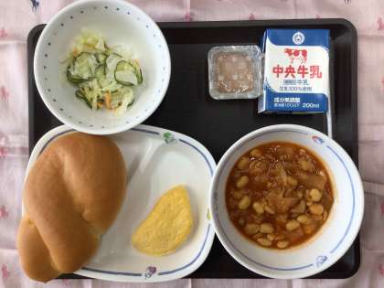 今日の献立は、「豊田ブランドの日献立」で、ポークビーンズ、コールスローサラダ、オムレツ、ももゼリー。ツイストパン、牛乳 でした。  エネルギー:872kcal