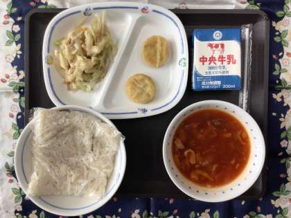 今日の献立は、あんかけスパ、ごぼうサラダ(和風ドレッシング)、たらナゲット、ソフトめん、牛乳 でした。  エネルギー:804kcal